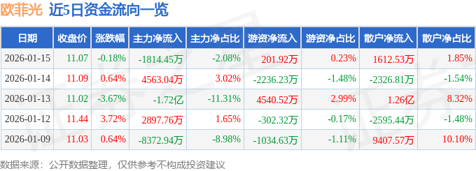 证券之星消息,截至2026年1月15日收盘,欧菲光(002456)报收于11.07元,下跌0.18%,换手率2.38%,成交量78.89万手,成交额8.74亿元。