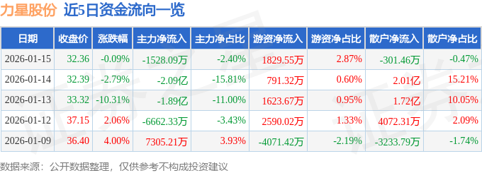 证券之星消息,截至2026年1月15日收盘,力星股份(300421)报收于32.36元,下跌0.09%,换手率8.53%,成交量19.65万手,成交额6.37亿元。