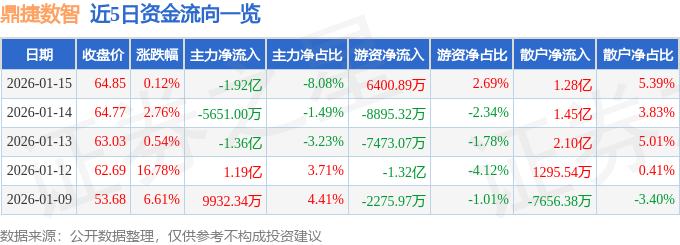 证券之星消息,截至2026年1月15日收盘,鼎捷数智(300378)报收于64.85元,上涨0.12%,换手率13.61%,成交量36.69万手,成交额23.75亿元。