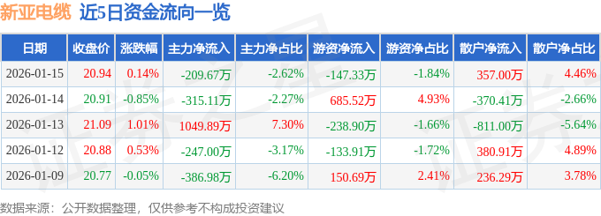 证券之星消息,截至2026年1月15日收盘,新亚电缆(001382)报收于20.94元,上涨0.14%,换手率6.19%,成交量3.84万手,成交额8008.88万元。