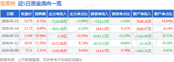 证券之星消息,截至2026年1月15日收盘,宝莱特(300246)报收于13.75元,上涨0.15%,换手率17.4%,成交量36.76万手,成交额5.12亿元。