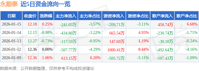 证券之星消息,截至2026年1月15日收盘,永顺泰(001338)报收于12.18元,上涨0.25%,换手率1.1%,成交量5.53万手,成交额6749.27万元。