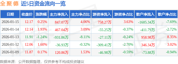 1月15日的资金流向数据方面,主力资金净流入847.07万元,占总成交额4.06%,游资资金净流入758.27万元,占总成交额3.63%,散户资金净流出1605.34万元,占总成交额7.69%。