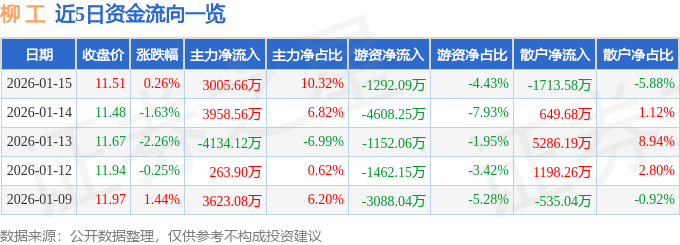 证券之星消息,截至2026年1月15日收盘,柳 工(000528)报收于11.51元,上涨0.26%,换手率1.24%,成交量25.27万手,成交额2.91亿元。