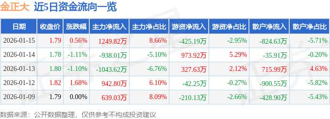 1月15日的资金流向数据方面,主力资金净流入1249.82万元,占总成交额8.66%,游资资金净流出425.19万元,占总成交额2.95%,散户资金净流出824.63万元,占总成交额5.71%。