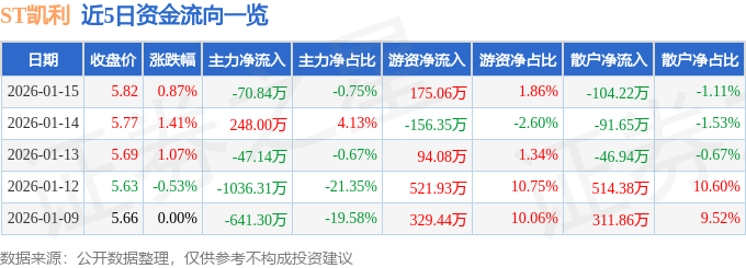 证券之星消息,截至2026年1月15日收盘,ST凯利(300326)报收于5.82元,上涨0.87%,换手率2.25%,成交量16.0万手,成交额9424.04万元。