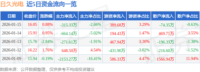 证券之星消息,截至2026年1月15日收盘,日久光电(003015)报收于16.05元,上涨0.88%,换手率3.01%,成交量7.45万手,成交额1.18亿元。