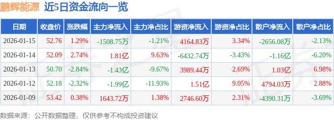 证券之星消息,截至2026年1月15日收盘,鹏辉能源(300438)报收于52.76元,上涨1.29%,换手率5.79%,成交量23.39万手,成交额12.45亿元。