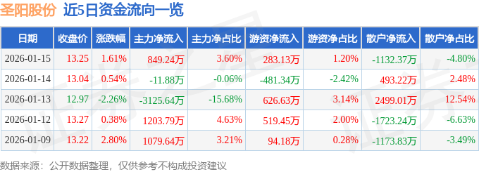 证券之星消息,截至2026年1月15日收盘,圣阳股份(002580)报收于13.25元,上涨1.61%,换手率3.94%,成交量17.82万手,成交额2.36亿元。