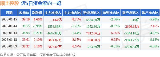 证券之星消息,截至2026年1月15日收盘,顺丰控股(002352)报收于39.19元,上涨1.66%,换手率0.99%,成交量47.41万手,成交额18.71亿元。