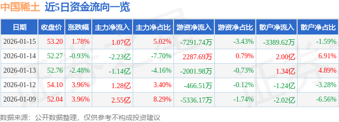 证券之星消息,截至2026年1月15日收盘,中国稀土(000831)报收于53.2元,上涨1.78%,换手率3.76%,成交量39.87万手,成交额21.27亿元。