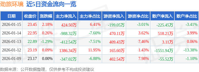 证券之星消息,截至2026年1月15日收盘,劲旅环境(001230)报收于23.45元,上涨2.18%,换手率5.34%,成交量2.83万手,成交额6619.98万元。