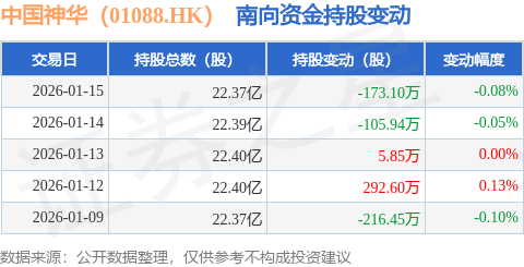 证券之星消息,1月15日南向资金减持173.1万股中国神华(01088.HK)。近5个交易日中,获南向资金减持的有3天,累计净减持197.04万股。近20个交易日中,获南向资金减持的有14天,累计净减持2514.4万股。截至目前,南向资金持有中国神华(01088.HK)22.37亿股,占公司已发行普通股的66.23%。