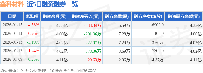 鑫科材料融资融券信息显示,融资方面,当日融资买入9852.08万元,融资偿还6318.74万元,融资净买入3533.34万元。融券方面,融券卖出0.0股,融券偿还6900.0股,融券余量6.59万股,融券余额27.35万元。融资融券余额4.35亿元。