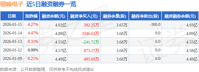 铜峰电子融资融券信息显示,融资方面,当日融资买入1.12亿元,融资偿还1.08亿元,融资净买入392.25万元。融券方面,融券卖出0.0股,融券偿还300.0股,融券余量3.65万股,融券余额38.29万元。融资融券余额4.93亿元。
