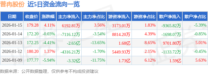 证券之星消息,截至2026年1月15日收盘,普冉股份(688766)报收于179.28元,上涨4.11%,换手率6.66%,成交量9.86万手,成交额17.37亿元。