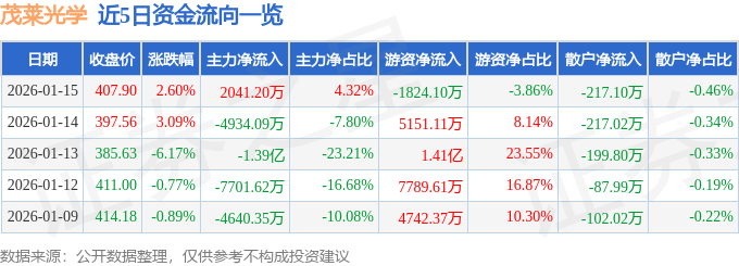 证券之星消息,截至2026年1月15日收盘,茂莱光学(688502)报收于407.9元,上涨2.6%,换手率7.02%,成交量1.18万手,成交额4.72亿元。