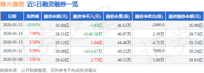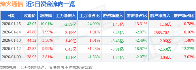 证券之星消息,截至2026年1月15日收盘,烽火通信(600498)报收于43.07元,下跌10.01%,跌停,换手率1.96%,成交量24.98万手,成交额10.76亿元。