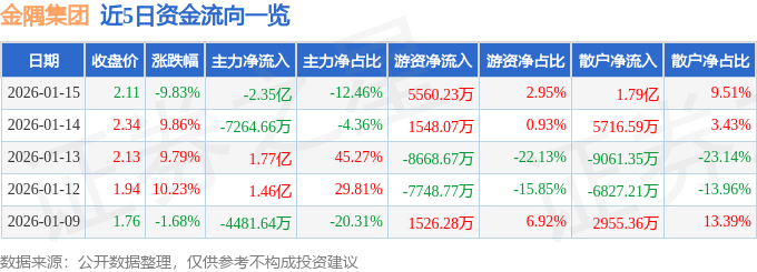 证券之星消息,截至2026年1月15日收盘,金隅集团(601992)报收于2.11元,下跌9.83%,跌停,换手率10.3%,成交量858.61万手,成交额18.84亿元。