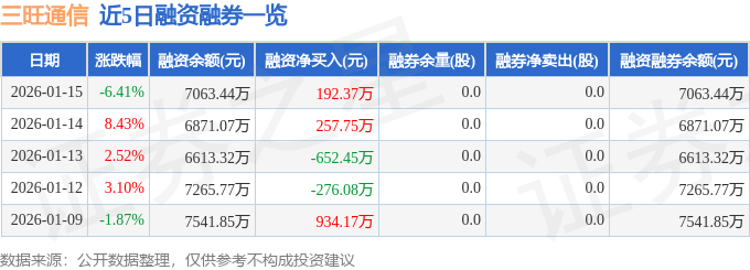 三旺通信融资融券信息显示,融资方面,当日融资买入1704.86万元,融资偿还1512.49万元,融资净买入192.37万元。融券方面,融券卖出0.0股,融券偿还0.0股,融券余量0.0股,融券余额0.0万元。融资融券余额7063.44万元。
