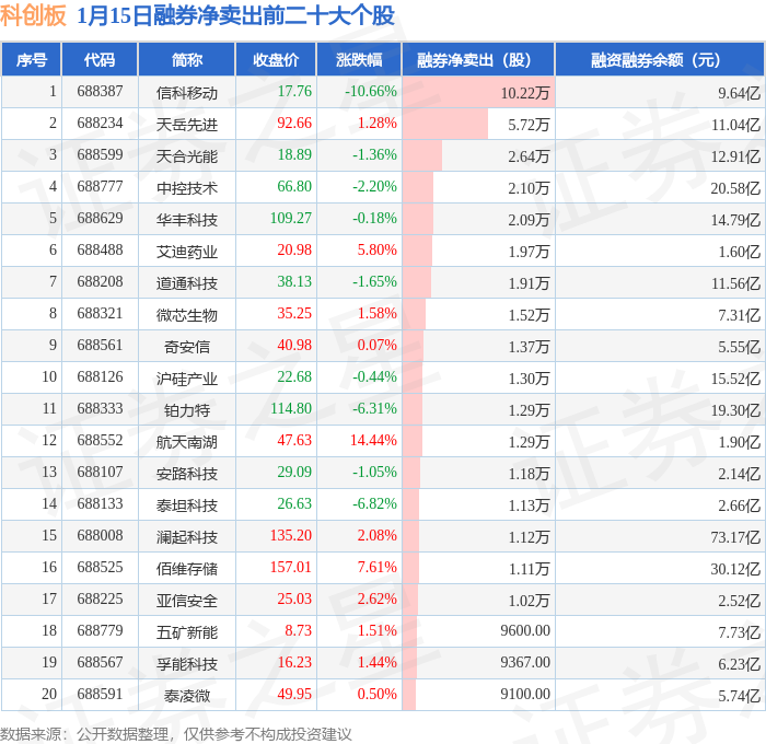 科创板融券净卖出前三分别为:信科移动(688387)融券净卖出10.22万股、天岳先进(688234)融券净卖出5.72万股、天合光能(688599)融券净卖出2.64万股,前20具体见下表:
