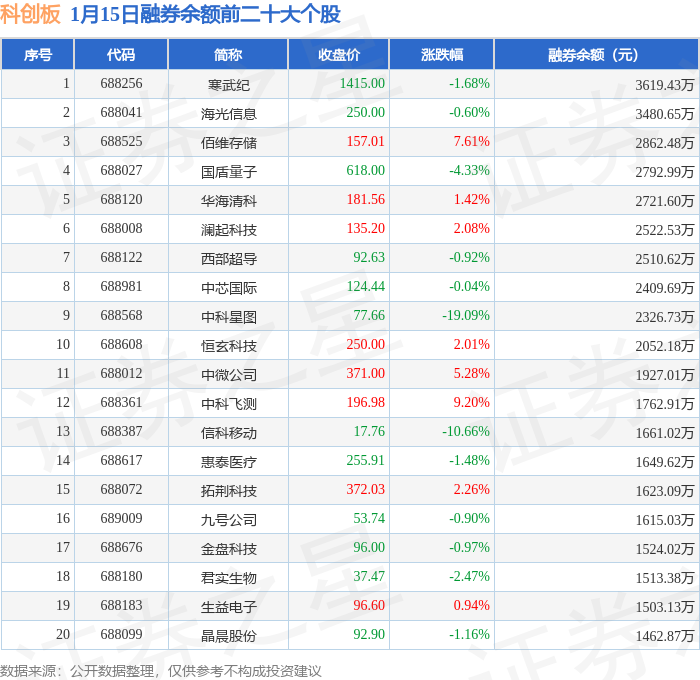 科创板融券余额前三分别为:寒武纪(688256)融券余额3619.43万元、海光信息(688041)融券余额3480.65万元、佰维存储(688525)融券余额2862.48万元,前20具体见下表: