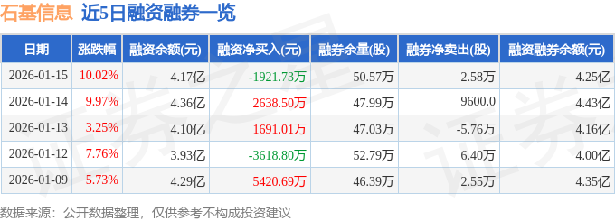 证券之星消息,截至2026年1月15日收盘,石基信息(002153)报收于16.14元,上涨10.02%,已连续涨停2天,换手率4.44%,成交量71.1万手,成交额11.47亿元。