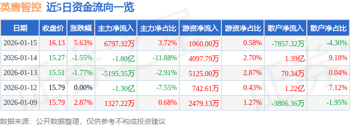 证券之星消息,截至2026年1月15日收盘,英唐智控(300131)报收于16.13元,上涨5.63%,换手率10.98%,成交量114.46万手,成交额18.25亿元。