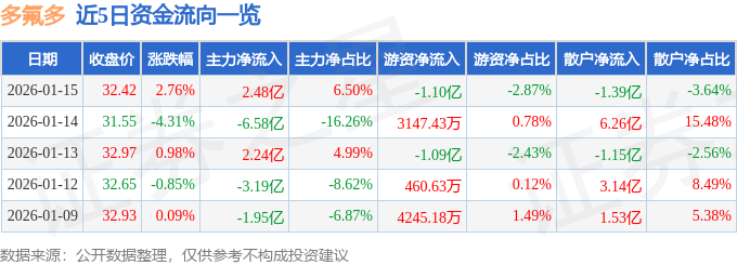 证券之星消息,截至2026年1月15日收盘,多氟多(002407)报收于32.42元,上涨2.76%,换手率10.87%,成交量117.44万手,成交额38.18亿元。