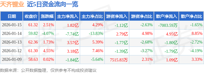 证券之星消息,截至2026年1月15日收盘,天齐锂业(002466)报收于61.32元,上涨2.51%,换手率4.66%,成交量68.77万手,成交额42.39亿元。