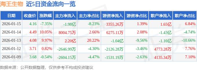证券之星消息,截至2026年1月15日收盘,海王生物(000078)报收于4.16元,下跌7.35%,换手率20.5%,成交量538.39万手,成交额24.1亿元。
