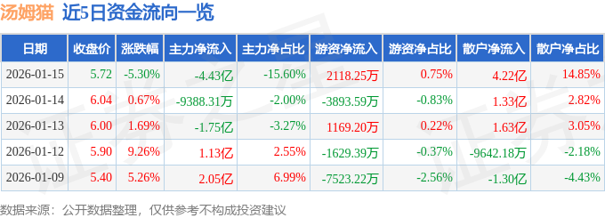 证券之星消息,截至2026年1月15日收盘,汤姆猫(300459)报收于5.72元,下跌5.3%,换手率15.08%,成交量495.82万手,成交额28.39亿元。