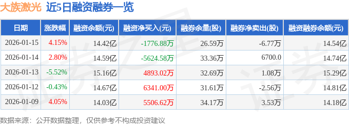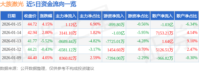 证券之星消息,截至2026年1月15日收盘,大族激光(002008)报收于44.72元,上涨4.15%,换手率3.86%,成交量36.9万手,成交额16.2亿元。