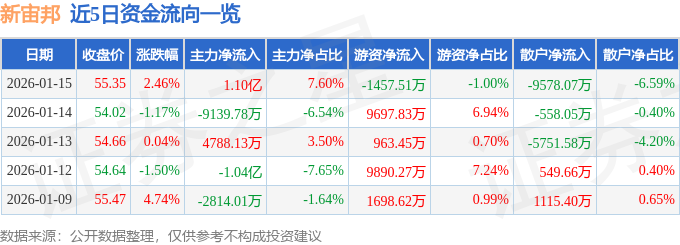 证券之星消息,截至2026年1月15日收盘,新宙邦(300037)报收于55.35元,上涨2.46%,换手率4.85%,成交量26.11万手,成交额14.53亿元。
