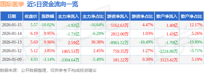 证券之星消息,截至2026年1月15日收盘,国际医学(000516)报收于5.57元,下跌10.02%,跌停,换手率9.25%,成交量204.04万手,成交额11.54亿元。