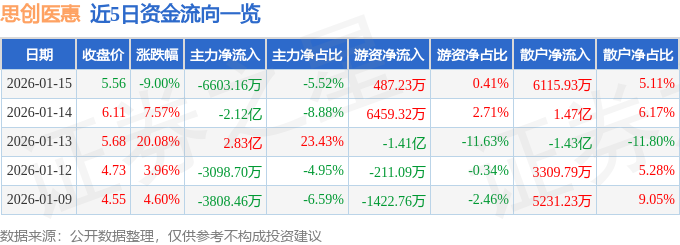证券之星消息,截至2026年1月15日收盘,思创医惠(300078)报收于5.56元,下跌9.0%,换手率19.41%,成交量216.08万手,成交额11.96亿元。