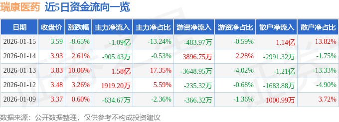 证券之星消息,截至2026年1月15日收盘,瑞康医药(002589)报收于3.59元,下跌8.65%,换手率16.68%,成交量227.75万手,成交额8.26亿元。