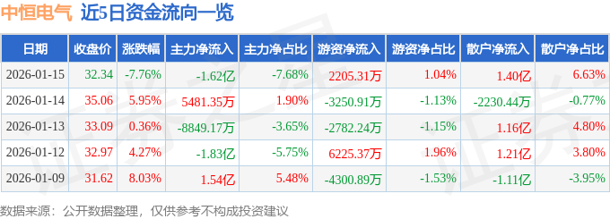 证券之星消息,截至2026年1月15日收盘,中恒电气(002364)报收于32.34元,下跌7.76%,换手率11.6%,成交量64.76万手,成交额21.12亿元。