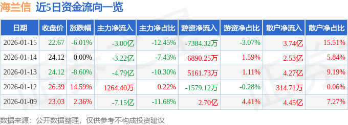 1月15日的资金流向数据方面,主力资金净流出3.0亿元,占总成交额12.45%,游资资金净流出7384.32万元,占总成交额3.07%,散户资金净流入3.74亿元,占总成交额15.51%。