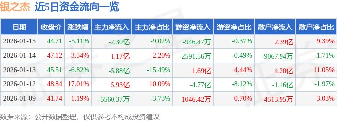 证券之星消息,截至2026年1月15日收盘,银之杰(300085)报收于44.71元,下跌5.11%,换手率8.64%,成交量56.36万手,成交额25.46亿元。