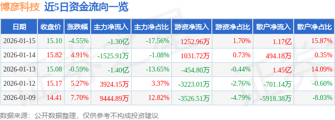 证券之星消息,截至2026年1月15日收盘,博彦科技(002649)报收于15.1元,下跌4.55%,换手率8.83%,成交量48.46万手,成交额7.38亿元。