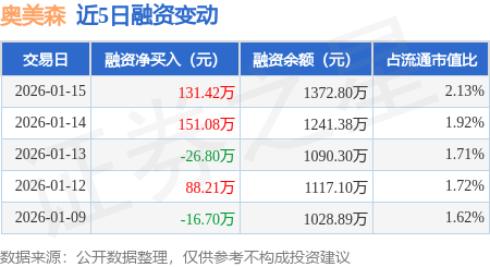 证券之星消息,1月15日,奥美森(920080)融资买入247.17万元,融资偿还115.75万元,融资净买入131.42万元,融资余额1372.8万元,近20个交易日中有12个交易日出现融资净买入。