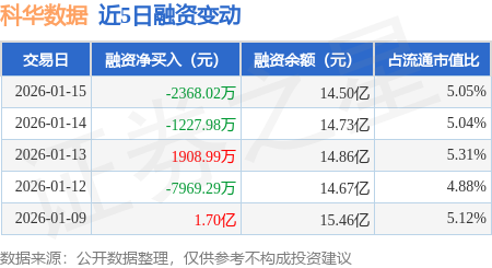 证券之星消息,1月15日,科华数据(002335)融资买入1.98亿元,融资偿还2.22亿元,融资净卖出2368.02万元,融资余额14.5亿元。