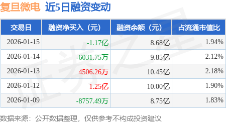 证券之星消息,1月15日,复旦微电(688385)融资买入2.26亿元,融资偿还3.43亿元,融资净卖出1.17亿元,融资余额8.68亿元,近20个交易日中有13个交易日出现融资净买入。
