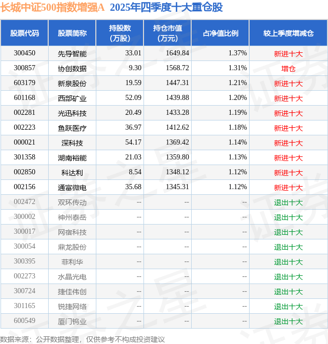 长城中证500指数增强A的前十大重仓股如下: