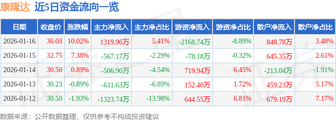 证券之星消息,截至2026年1月16日收盘,康隆达(603665)报收于36.03元,上涨10.02%,涨停,换手率4.33%,成交量6.93万手,成交额2.44亿元。