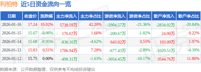 证券之星消息,截至2026年1月16日收盘,利柏特(605167)报收于17.24元,上涨10.02%,涨停,换手率1.79%,成交量8.02万手,成交额1.36亿元。