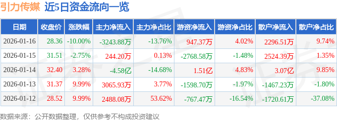 证券之星消息,截至2026年1月16日收盘,引力传媒(603598)报收于28.36元,下跌10.0%,跌停,换手率3.08%,成交量8.3万手,成交额2.36亿元。