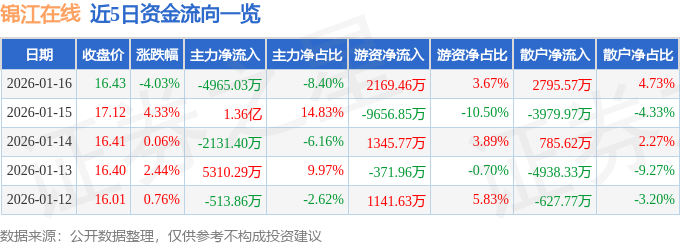 证券之星消息,截至2026年1月16日收盘,锦江在线(600650)报收于16.43元,下跌4.03%,换手率9.07%,成交量35.41万手,成交额5.91亿元。