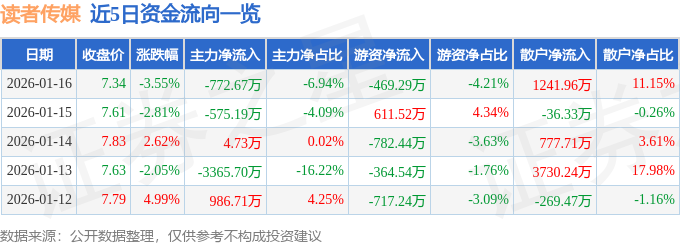 证券之星消息,截至2026年1月16日收盘,读者传媒(603999)报收于7.34元,下跌3.55%,换手率2.61%,成交量15.05万手,成交额1.11亿元。
